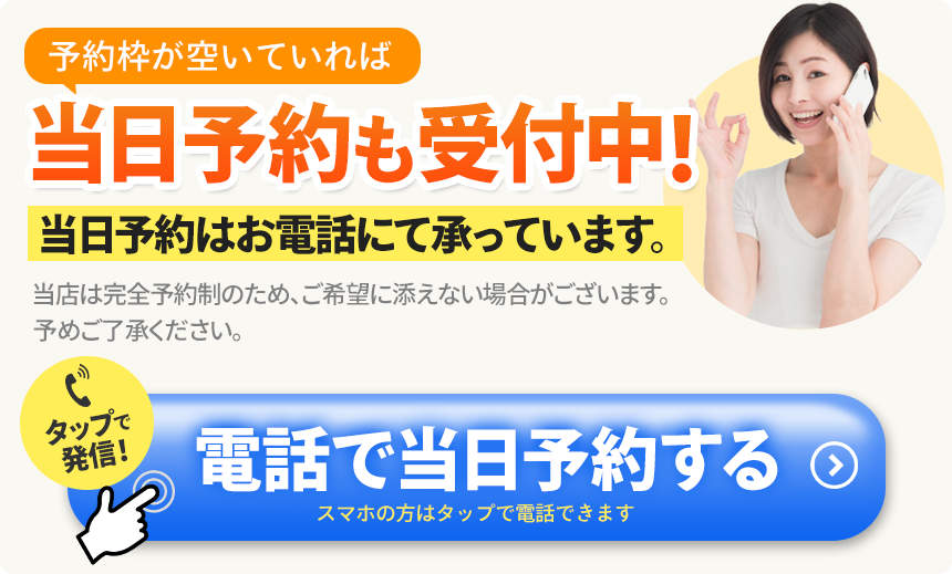 完全予約制なので待ち時間もほとんどなく、当日のご予約も可能な限り対応いたします。